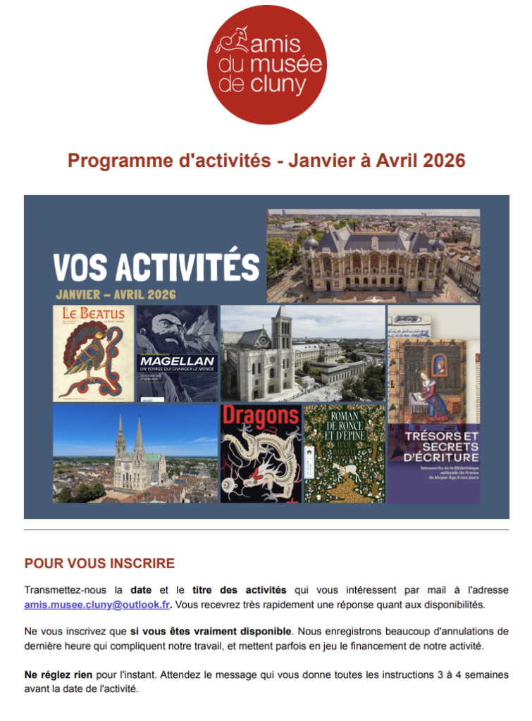 Transmettez-nous vos souhaits par mail à l’adresse suivante : amis.musee.cluny@outlook.fr en précisant la date et le titre des activités qui vous intéressent.